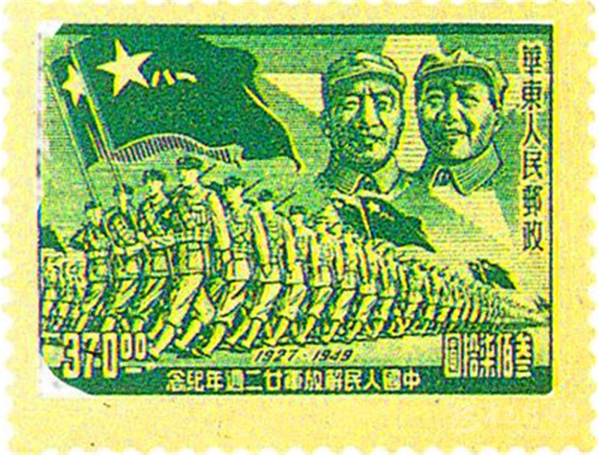 我國最早出現(xiàn)“八一軍旗”的郵票,是1949年8月1日, 剛解放的上海華東人民郵政發(fā)行的《中國人民解放軍建軍22周年》俗稱《華東進(jìn)軍圖》郵票(圖1),一套5枚,同圖異色異值,郵票右上方為毛澤東主席和朱德總司令頭像,下方是鐵流般的人民軍隊高舉著一面面“八一軍旗”。 同年12月,西南區(qū)人民郵政又發(fā)行一套11枚圖案相同“西南進(jìn)軍圖”郵票(圖2)。