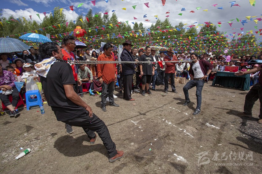 除以上活動,滾桶接力、俯撐馬鞍吃葡萄、穿藏裝揉糌粑、套牛角等趣味比賽無不展示民族體育的獨(dú)特風(fēng)格?!斑@種拔河還是第一次見,很有意思。”其中,“格吞”比賽(把帶子套在脖子上拔河)深得觀眾喜愛。