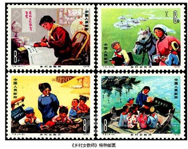 “燃燒自己,照亮別人”,是每一位教書人的精神寫照。在我國(guó)發(fā)行的郵票中就常常出現(xiàn)那些工作在基層的普通教師的忙碌身影。1959年9月25日,我國(guó)發(fā)行《人民公社》特種郵票,其中第5枚“學(xué)”,圖案是一位手執(zhí)課本神情專注地在課堂上教學(xué)的老師。這是我國(guó)郵票中首次出現(xiàn)教師形象。1966年5月10日,我國(guó)發(fā)行《服務(wù)行業(yè)中的婦女》特種郵票,其中第4枚“保育員”,是反映我國(guó)幼兒教師工作情景的一枚郵票。1976年2月20日,我國(guó)發(fā)行《勝利完成第四個(gè)五年計(jì)劃》紀(jì)念郵票,其中第13枚“牧區(qū)小學(xué)”,圖案是一位藏族女教師在寬敞明亮的教室里授課的情景,反映了新中國(guó)成立后,特別是第四個(gè)五年計(jì)劃期間,我國(guó)少數(shù)民族地區(qū)飛速發(fā)展的教育事業(yè)。1975年3月8日,我國(guó)發(fā)行《鄉(xiāng)村女教師》特種郵票,全套4枚,圖案分別是“認(rèn)真看書學(xué)習(xí)”“巡回教學(xué)”“開門辦學(xué)”和“水上小學(xué)”。全套郵票是工作在廣大農(nóng)村的中小學(xué)教育工作者在辦學(xué)條件艱苦的情況下仍然堅(jiān)持認(rèn)真學(xué)習(xí)、勤奮工作、忠于黨的教育事業(yè)的真實(shí)寫照。