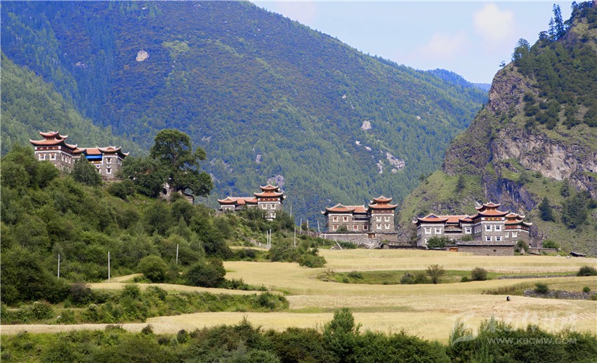藏寨從大金河谷層層疊疊向上攀緣,在相對高差近千米的山坡上,一幢幢藏式樓房或星羅棋布,或稠密集中,錯落有致。不時炊煙裊裊、云霧繚繞,詩情畫意。