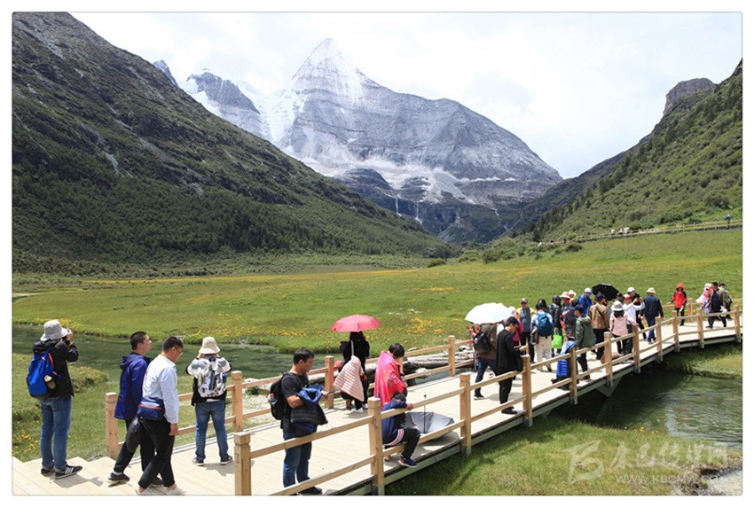 沒想到從景區(qū)的接駁車上一下來,第一眼看到的雪山就是仙乃日神山,而且,就在我們進(jìn)入核心景區(qū)方向的右手邊上,一種近在咫尺的即視感!于是,人可是要有多激動(dòng)就有多激動(dòng)了。