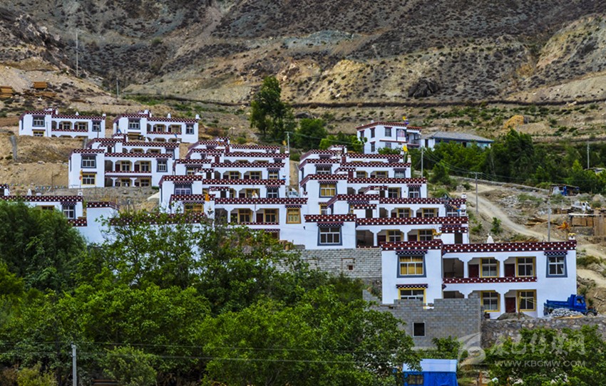 從得榮縣城出發(fā),途經(jīng)日龍鄉(xiāng),汽車順著盤山公路開始往下行駛,到半山腰處,司機輕輕踩一腳剎車熄火,在此作短暫休息。這時,我打開車門俯瞰金沙江畔的因都壩,但見公路兩側(cè)一排排整齊的房屋像火柴盒一樣連綴在平坦壩子上,房屋下端,麥田梯次舒展,麥浪涌動,蔚為壯觀。