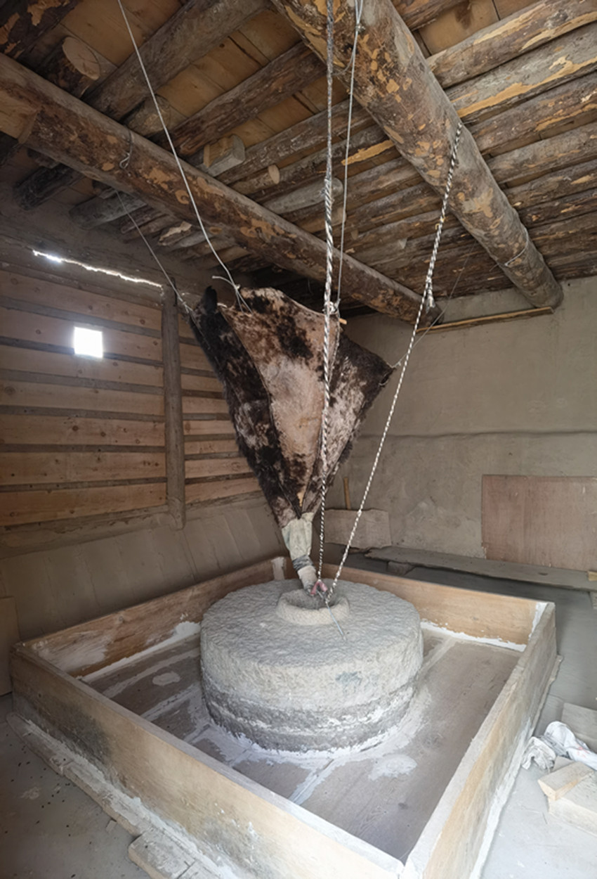一條約三米寬的水渠橫穿眼前,水渠在側(cè)面依次開了七個口子。上游三個用來排水,冬天用隔板擋著,夏天則用來泄水。中游三個口子都是磨坊的動力來源。走進(jìn)去是一處水磨坊,三座半徑約0.8米的石磨間隔1.7米一字排開。頂端是牛皮制成的青稞喂料器,由四根繩子系在房間頂角的不同方向;尾端是由牛角制作的喂料嘴,略顯復(fù)雜的繩拉式調(diào)節(jié)器錯綜復(fù)雜,但卻精妙無比地控制著青稞的出料速度。