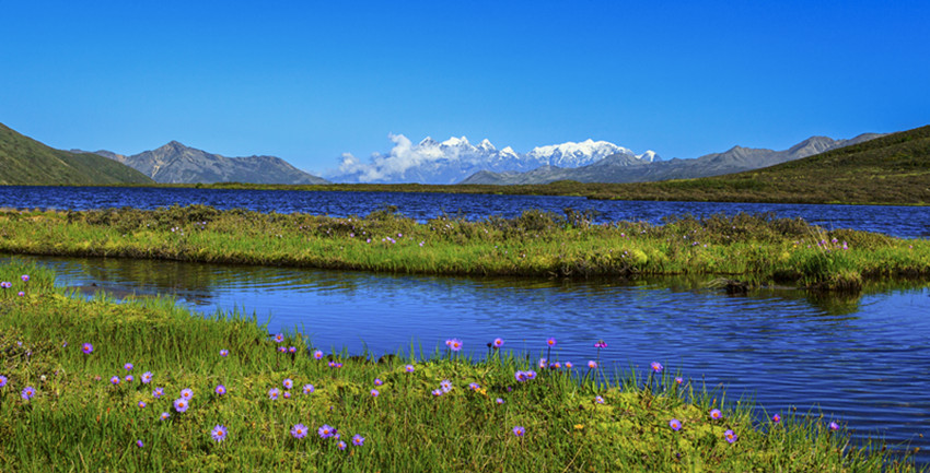 在山谷中穿行十余公里,路面一點點抬起,上了貢嘎山脈,徑直進入康定情歌景區(qū)。隨著海拔的升高,涼意漸濃。山依舊是主角,地勢卻變得平緩而開闊,有茵茵的草地,有大小湖泊,沿途山泉潺潺,野花點綴,空氣清幽,方才單調(diào)的褐色很快被淡忘。山體漸次出現(xiàn)密集而低矮的灌木,枝條筆直地立著,有高寒山區(qū)的凜然之氣。灌木一層層上延,樹木雜多,大片的原始森林漫過山體,將大山包裹起來。遠處,藍天白云之下,貢嘎雪山在群峰中探出頭來,擦亮高空的陽光。澄明的空氣里,仿佛可以聽見雪??┛┑匦Αx那間,仿佛所有的大山,都開始舒展筋骨。