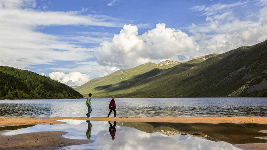 木格措特殊的位置和完好的生態(tài),造就了“一日四時景、早晚不同天”的自然奇觀。高原的第一縷晨光越過遠峰,均勻地鋪灑在木格措湖面,湖水蘇醒過來,水面煙波浩渺,薄紗飛卷,如同早起后對鏡梳妝的仙女。午后有微風,遠處湖面靜若處子,近前卻有微瀾拂岸,動靜之間,盡得自然自在。斜陽西下,余暉投灑在水面上,湖水濃墨重彩,任意涂抹,水天一體,你我也融合在靜謐的湖光夜色中了。
