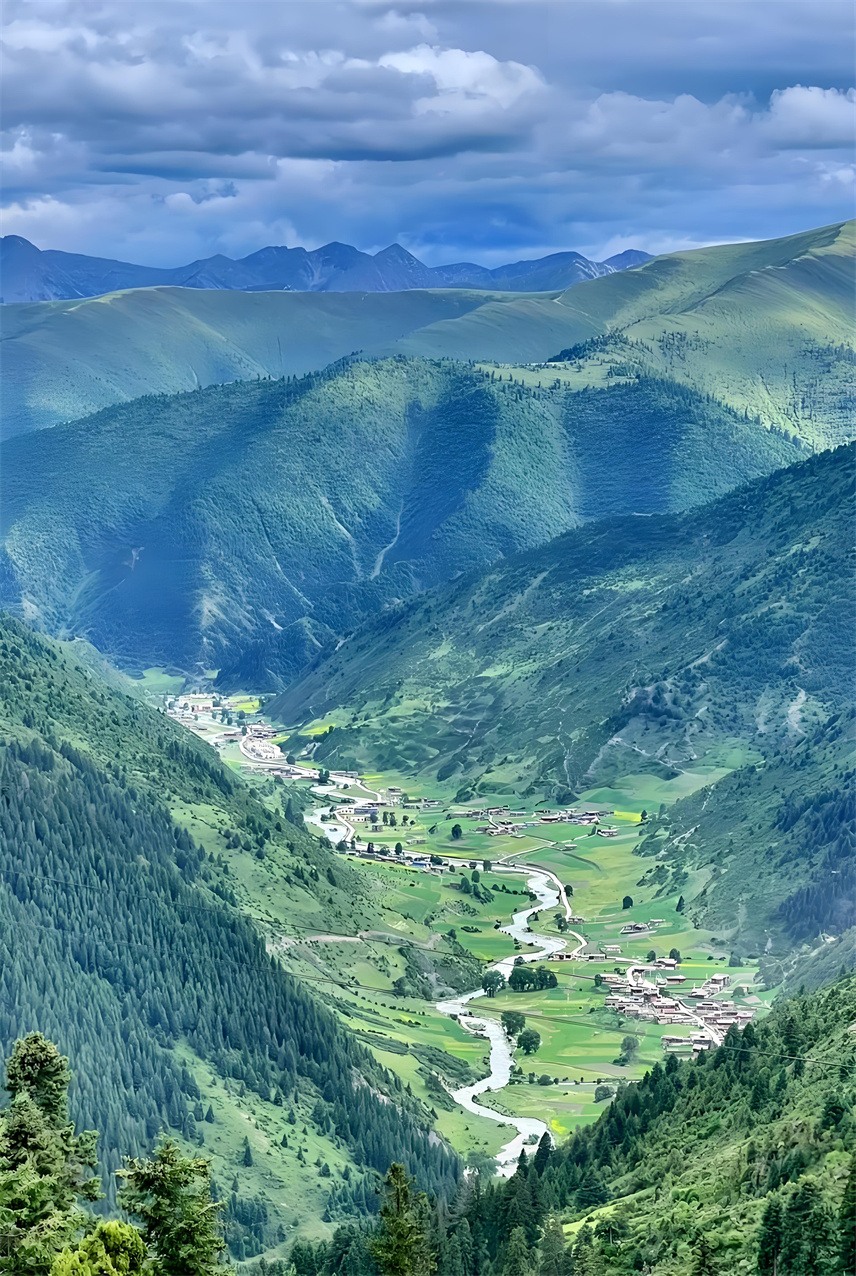 眼前,河谷兩旁的青山上,長滿參天古樹,像一個個衛(wèi)士守護著這片綠洲;沙魯里山脈的冰雪融水順著蜿蜒的麥曲河,澆灌著兩旁綠意蔥籠的青稞地、豌豆地,滋潤著彌漫香味的種有中藏藥材的土地;絳紅色藏房散落在河谷間,不時有小孩打開窗戶,探出小腦袋,羞澀地露出滿臉燦爛的笑容;臉上布滿高原紅的阿姐沖我們打招呼,說著我們不太懂的藏語,充滿熱情。