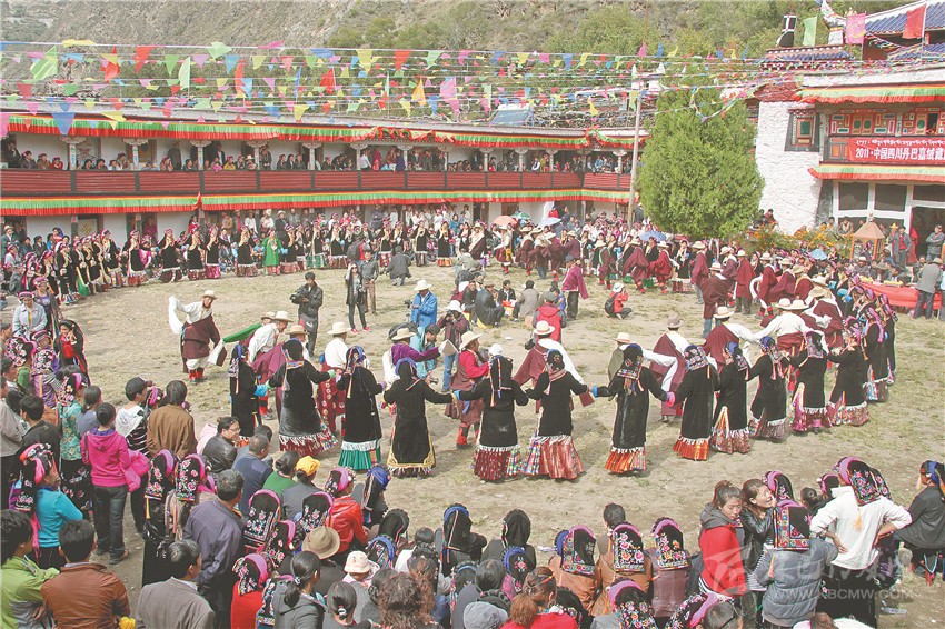 該志記述的與嘉絨鍋莊表演形式、內(nèi)容十分貼切,足見(jiàn)當(dāng)時(shí)嘉絨鍋莊的內(nèi)容豐富、曲調(diào)之多是任何一個(gè)舞種所不能比擬的。從這段文字描述中可以知道,嘉絨鍋舞的歌詞內(nèi)容主要包括嘉絨藏族的生息發(fā)展、歷史上的各種征戰(zhàn)、區(qū)域版圖的變遷以至四季氣候的變化、春播秋收的時(shí)間、生兒育女的賀喜、男女之間的調(diào)情、修房造物的歡慶等等。