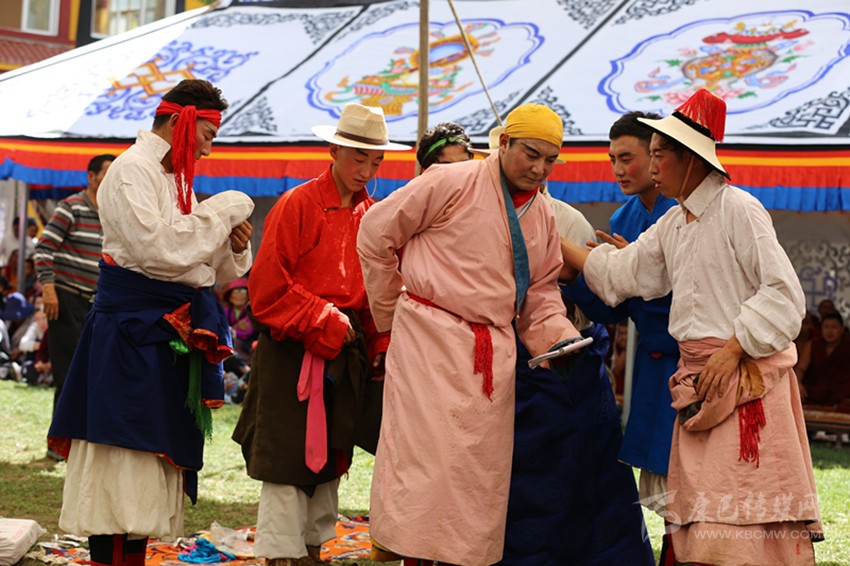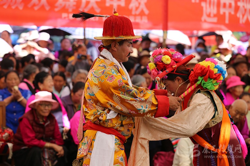九月,龍王塘,藏戲《嘎拉旺布》演出現(xiàn)場。西繞反串花仙卓瓦桑姆,他頭戴花冠,頂上的三叉“巴珠”(后藏女人的一種頭飾)上插滿了粉色和紅色的絹花。身上穿著各色綢緞拼制成的無袖藏袍“拉姆切”,上套無袖彩條花氆氌帶和藍綠花緞帶連綴成的褂子。踩著鼓與鈸敲擊出的節(jié)奏,他的兩只腳進、頓、點、退,舞步輕盈,手腕跟隨節(jié)奏,以頭部和肩部為限,左舞右蹈,用肢體語言表現(xiàn)人物的思想感情,這是該劇第一幕《定情月下》:湖畔仙景,卓瓦桑姆偕眾仙女婆娑起舞。國王隨仙鹿而來,向卓瓦桑姆傾訴衷情,花仙為國王的真情所動,愿永結同心。仙翁降臨贈箭祝福,二人辭別眾仙……。炎炎烈日下,西繞薄施脂粉的面頰已被幾行汗水弄花,但他不以為意,此時此刻,他不是西繞,而是花仙卓瓦桑姆。從進場伊始,他便與角色融為一體。周遭的觀眾認真觀看、解讀,現(xiàn)場一片和諧,最美的時光在這一刻被盡情雕刻。