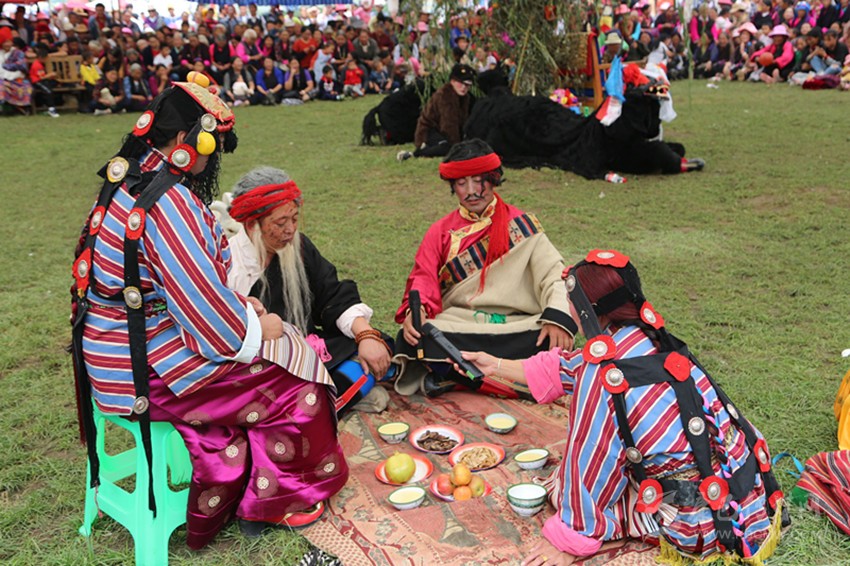 無論是小時候還是現(xiàn)在,“央勒節(jié)”都是我們期盼的節(jié)日,看不懂藏戲,但必須去湊鬧熱,否則這一年就有缺憾。父親作為家中老大,節(jié)前一個月會組織他的兄弟姐妹們開個家庭會議,商議湊錢、做飯、家什等各種細小瑣事,然后派出家族中幾個壯勞力去“龍王塘”約定束成的地盤上拔草、平地、做記號,表明“德嘎”家族今年還要在這個地方搭帳篷,其他人家看到記號,不會再來占地盤。節(jié)日前一天,稱為“亞堆”,不管有多麻煩,都要在這一天把家搬下去,晚上守帳篷的通常是堂姐夫,做飯洗碗則是我們姐妹們的任務?!褒埻跆痢庇袃裳蹨厝捎谒|的原因,酥油茶和冒面與自來水做出來的不是一個味兒,非常清香。特別喜歡“央勒節(jié)”之夜,它是一首詠嘆調:浩瀚的星光下,巴楚河的潮汐恢宏豐沛,金沙江在九公里處等待它的匯入;“龍王塘”幾百個帳篷透出光亮,依稀可見人影綽綽,“好風如水,清景無限”,巴塘人對閑適生活的追求在這一刻表達得淋漓盡致。我們期待著藏戲的鼓鈸和唱腔悠揚婉轉地傳入帳篷中,做什么都有心情,勁頭十足。