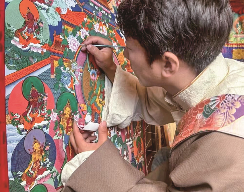 “唐卡作為中國(guó)民族繪畫藝術(shù)的珍品,不僅呈現(xiàn)精湛的技藝和美學(xué),更是傳遞一種文化?!睏畹潜硎?,他作為一名縣級(jí)非遺傳承人,要在繼承傳統(tǒng)技藝的基礎(chǔ)上,采用多元藝術(shù)技藝賦予傳統(tǒng)唐卡更多創(chuàng)意,讓民族文化瑰寶能夠更好地發(fā)揚(yáng)光大。