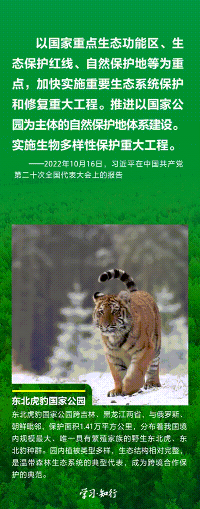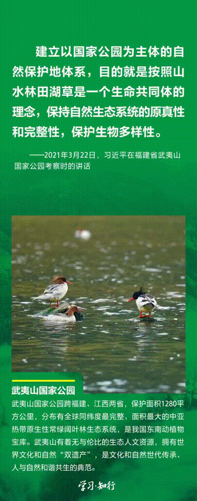 “生物多樣性使地球充滿生機,也是人類生存和發(fā)展的基礎(chǔ)?!蓖七M以國家公園為主體的自然保護地體系建設(shè),是習(xí)近平總書記作出的重要部署。三江源、大熊貓、東北虎豹、海南熱帶雨林、武夷山等首批國家公園正式設(shè)立以來,生態(tài)功能持續(xù)向好,對保護生物多樣性、推進人與自然和諧共生的現(xiàn)代化具有重要意義。