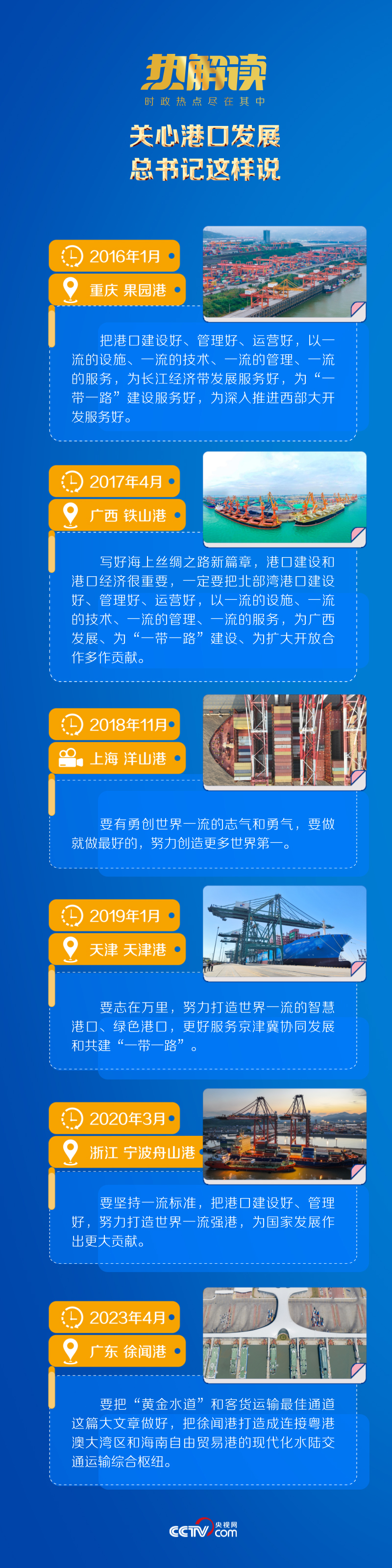 總書記曾深刻指出:“經(jīng)濟(jì)強(qiáng)國必定是海洋強(qiáng)國、航運(yùn)強(qiáng)國。”他希望我國港口建設(shè)“要志在萬里”,“為國家發(fā)展作出更大貢獻(xiàn)”。