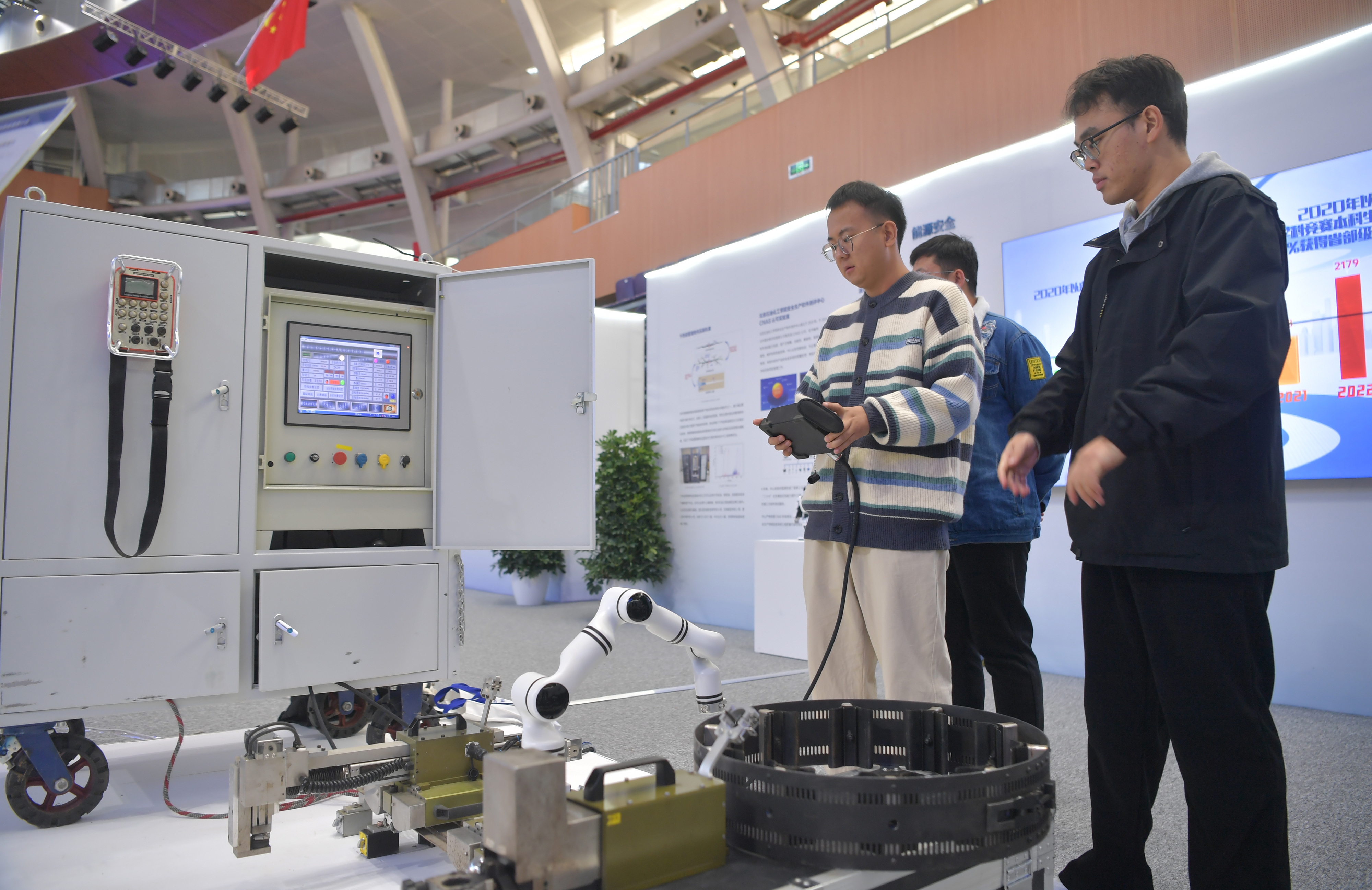 2023年,京南地區(qū)高??萍汲晒平闀诒本┙ㄖ髮W大興校區(qū)舉行。圖為高校師生在展示管道全位置焊接機器人系統(tǒng)成果。