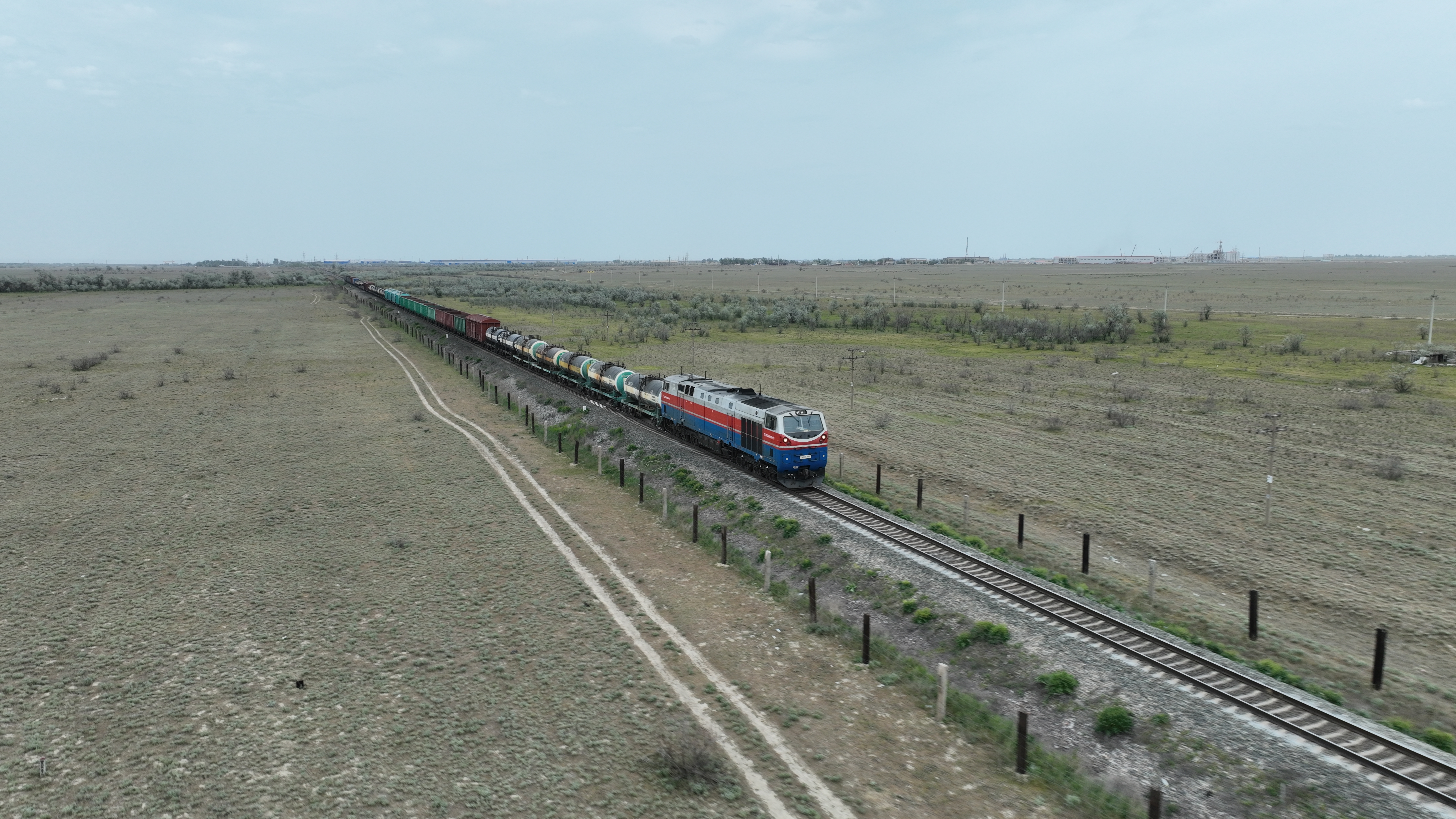 △ 2023年5月12日,在哈薩克斯坦阿拉木圖附近,貨運列車馳騁于阿拉木圖與中國霍爾果斯間(無人機照片)。