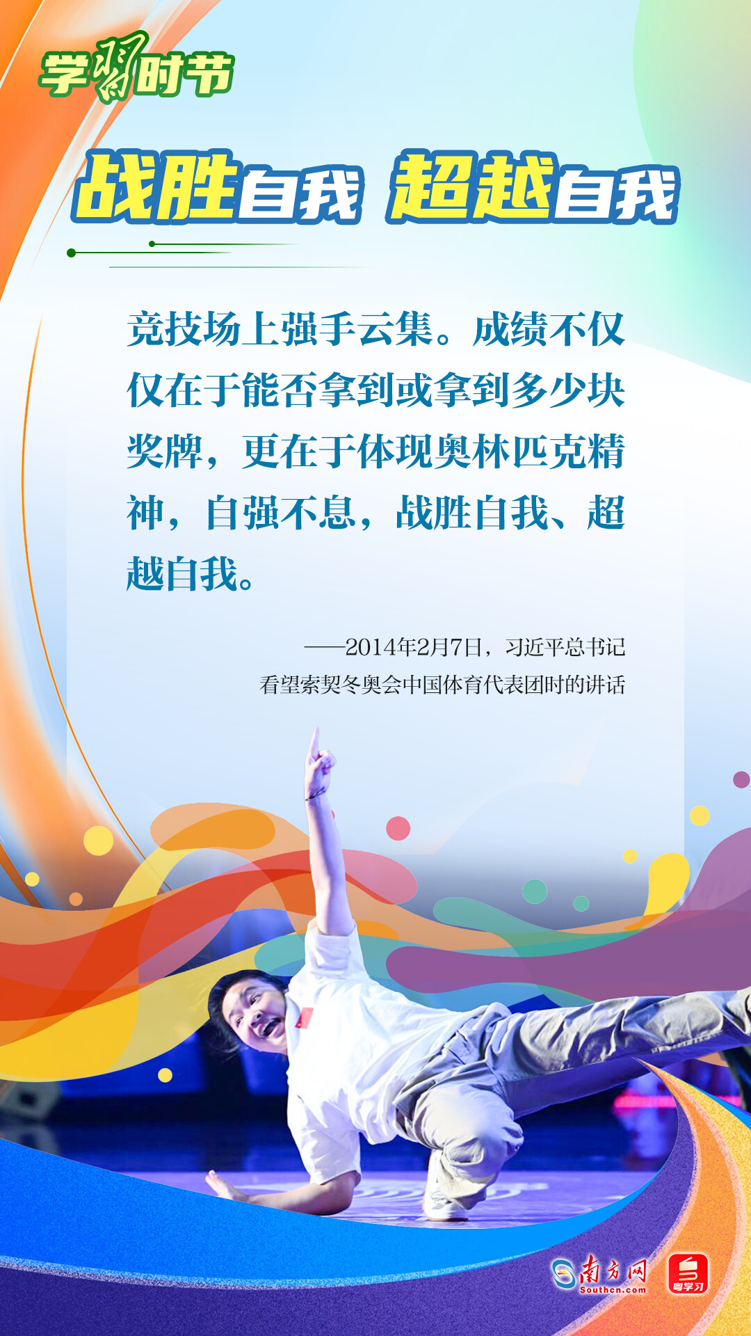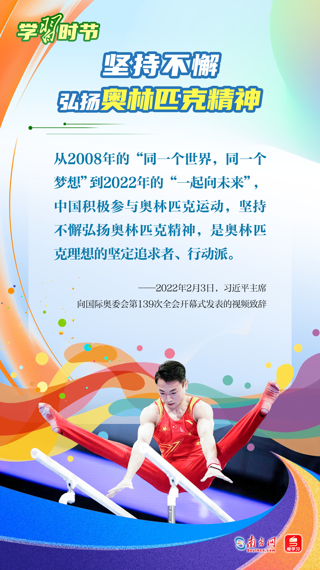 “我們不以勝負論英雄,同時英雄就要敢于爭先、敢于爭第一?!绷?xí)近平總書記曾在不同場合論述奧林匹克精神,深刻闡明了勝與負、成與敗的辯證關(guān)系,對奧林匹克“更快、更高、更強——更團結(jié)”的格言進行詮釋。讓我們一同學(xué)習(xí)習(xí)近平總書記對奧林匹克精神的重要論述,心懷夢想、奮勇拼搏,攜手走向美好明天。