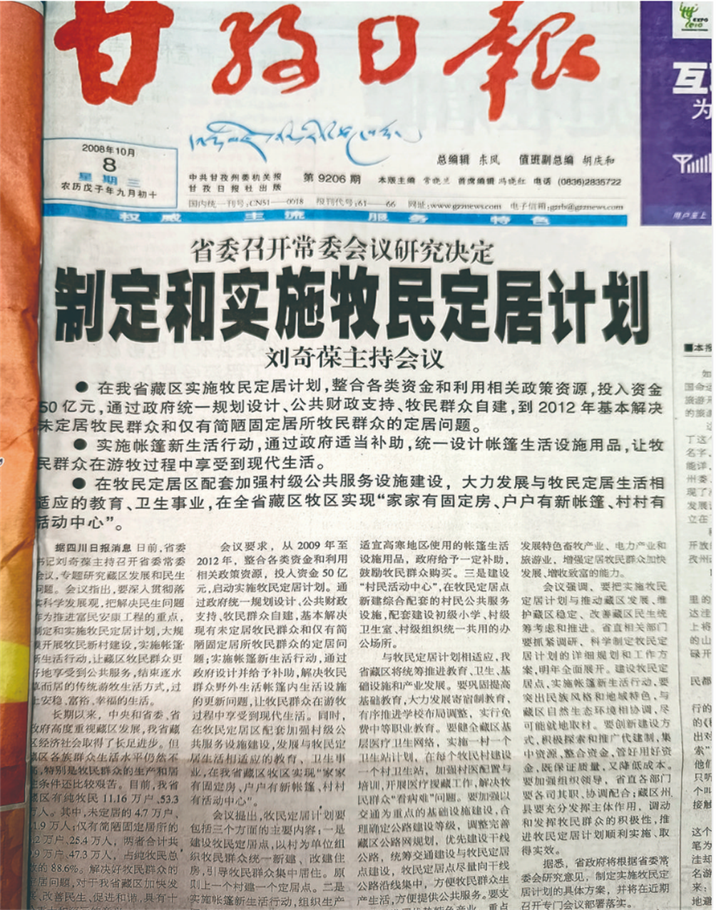 翻開(kāi)2008年10月8日《甘孜日?qǐng)?bào)》第一版,頭條新聞《制定和實(shí)施牧民定居計(jì)劃》中載明,省委、省政府作出決定,把解決民生問(wèn)題作為推進(jìn)富民安康工程的重點(diǎn),在全省涉藏地區(qū)牧區(qū)推行“牧民定居計(jì)劃”,力求在2012年結(jié)束全省涉藏地區(qū)牧民的游牧無(wú)定居生活。2009年1月,甘孜州的摸底數(shù)據(jù)表明,“牧民定居行動(dòng)計(jì)劃”的落地實(shí)施,會(huì)讓當(dāng)?shù)?.7萬(wàn)戶(hù)、26萬(wàn)牧民直接獲益。