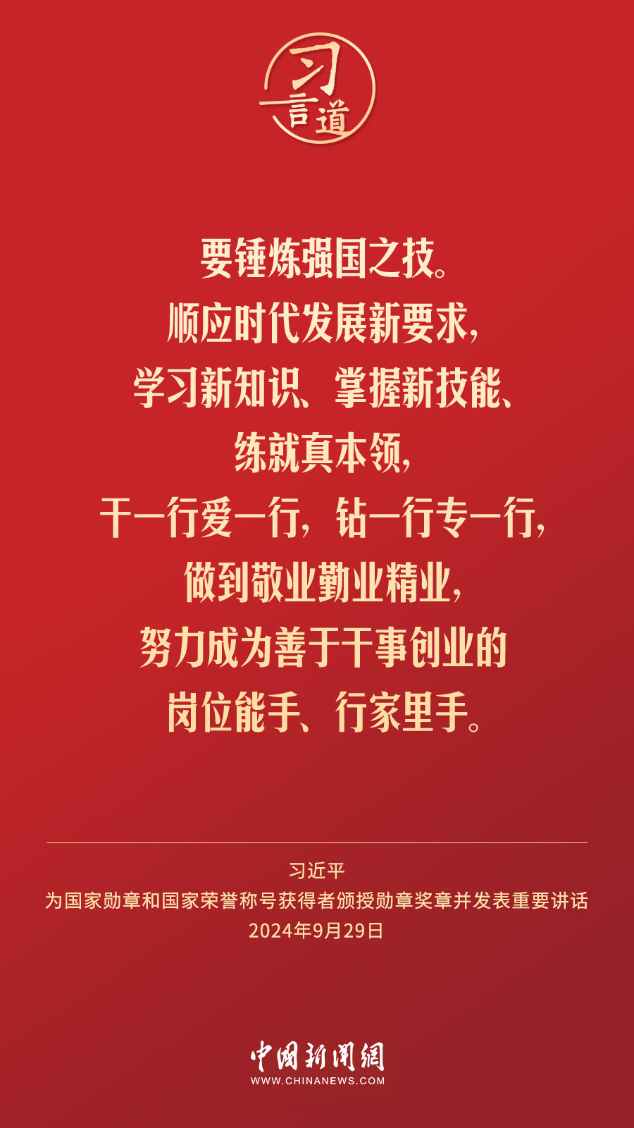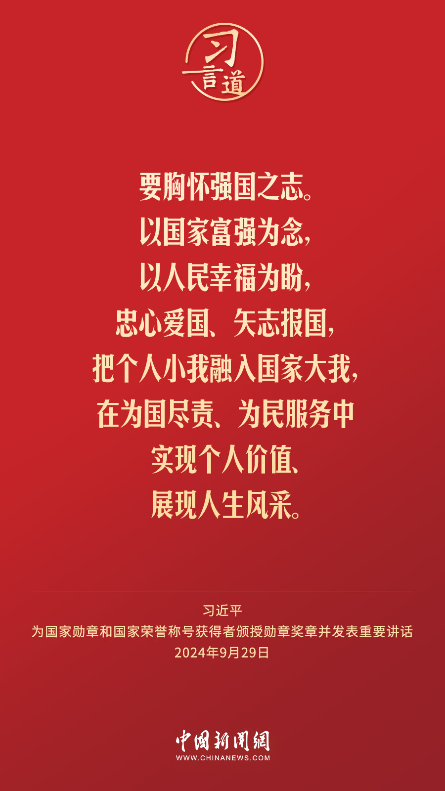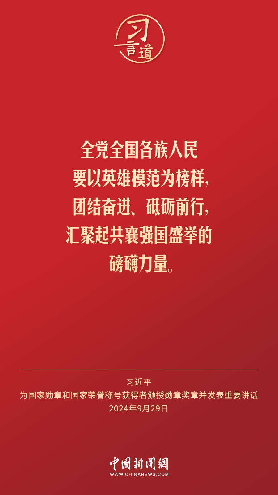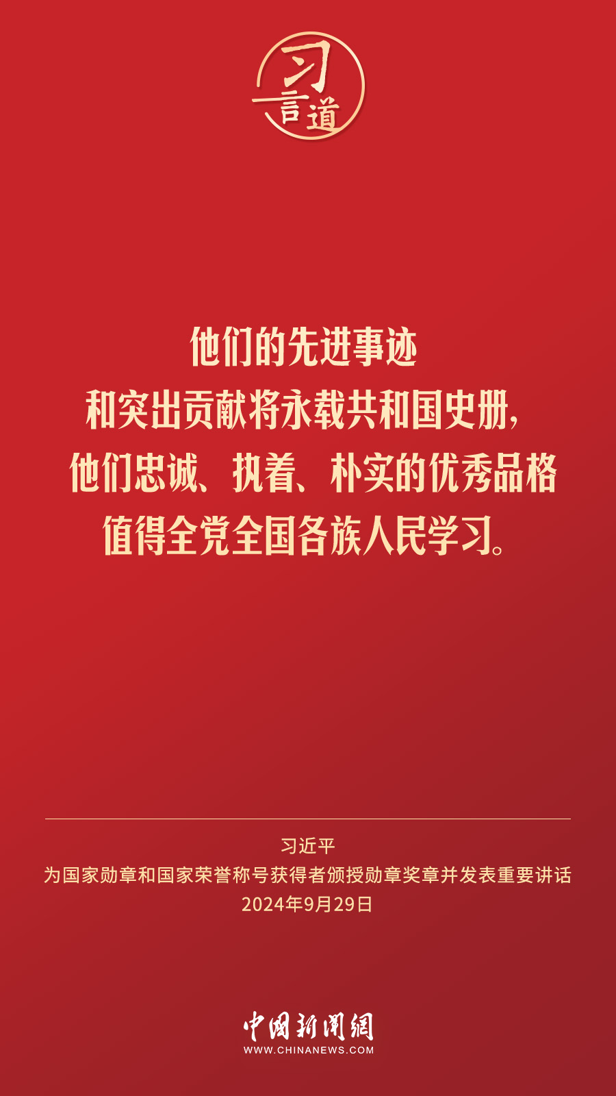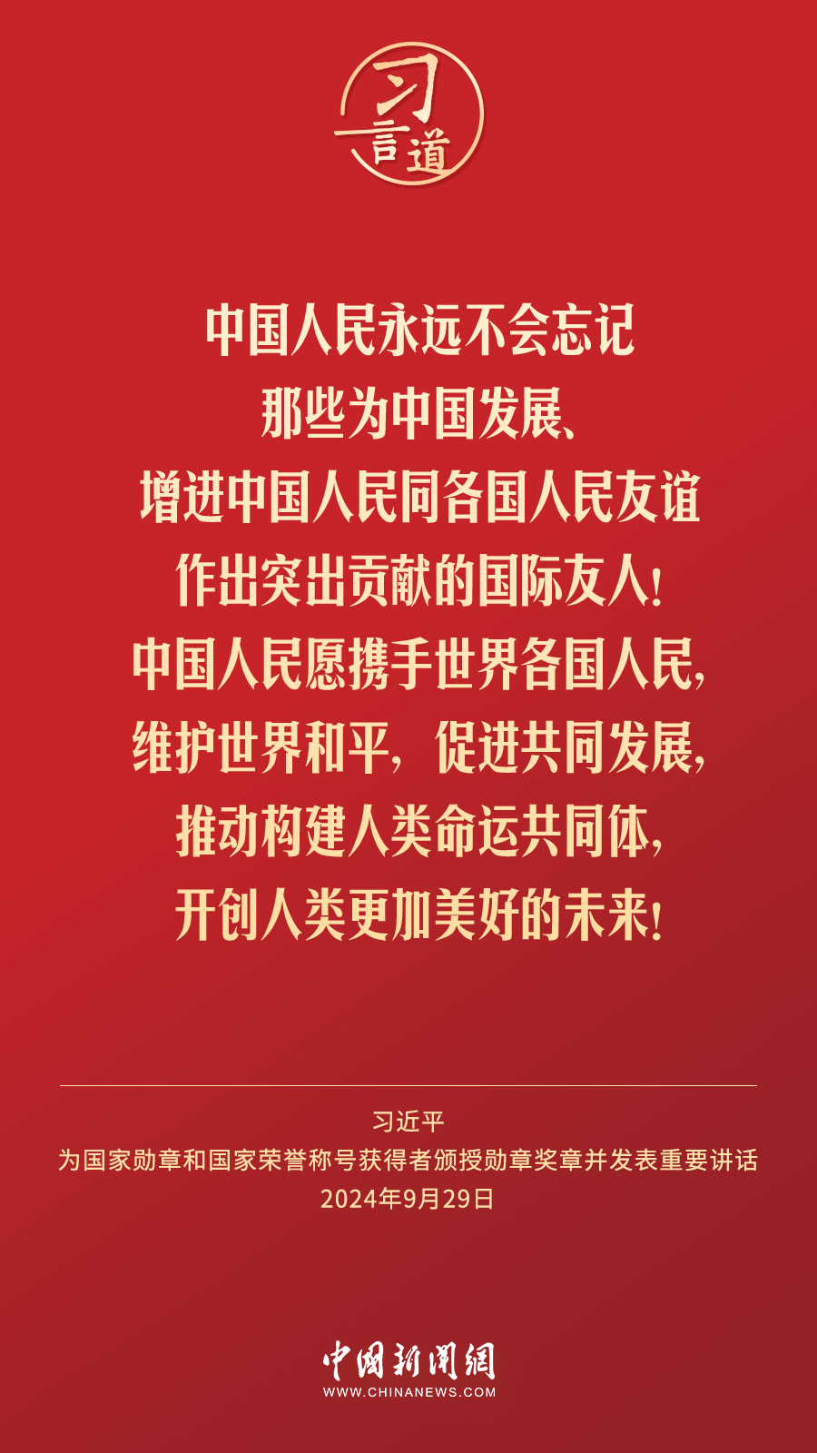 經(jīng)中共中央批準(zhǔn),中華人民共和國國家勛章和國家榮譽(yù)稱號頒授儀式于9月29日上午10時在人民大會堂隆重舉行。中共中央總書記、國家主席、中央軍委主席習(xí)近平向國家勛章和國家榮譽(yù)稱號獲得者分別授予“共和國勛章”“友誼勛章”和國家榮譽(yù)稱號獎?wù)虏l(fā)表重要講話。習(xí)近平指出——