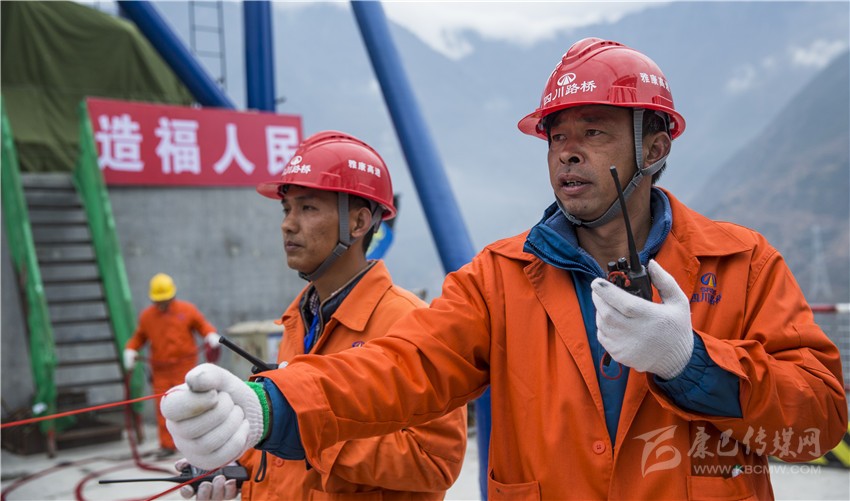 圖為施工人員通力合作讓導(dǎo)索精準跨越大渡河。胡廷輝