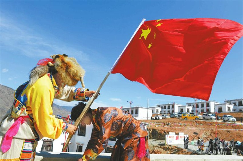 得榮縣白松鄉(xiāng)同歸村村民搬新家,在房頂上插上國(guó)旗。 (資料圖片)