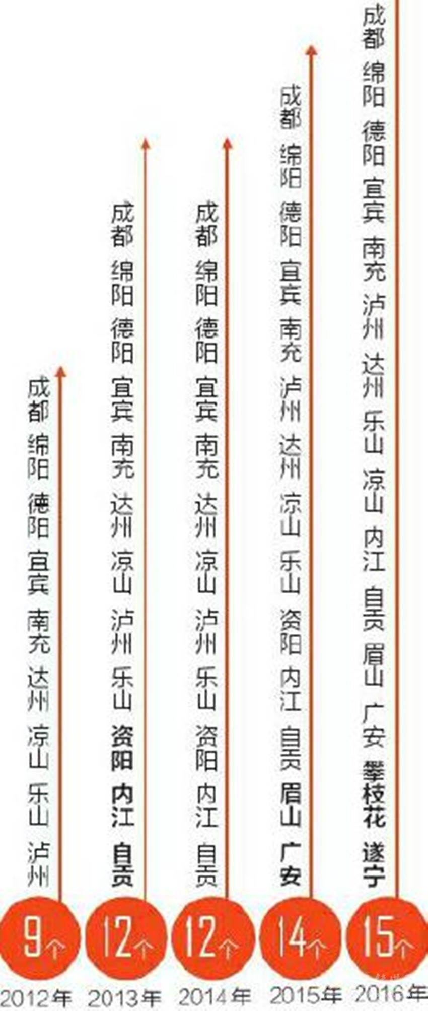 2012年,全省GDP過千億的市州只有9個(gè),到2016年已經(jīng)達(dá)到15個(gè)。除成都外,14個(gè)市州都在1000億元到2000億元之間,相鄰兩個(gè)市州的平均差距只有60億元左右,最大差距不到100億元,最小差距只有1億多元。