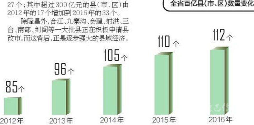 放眼全省,2016年,GDP突破百億元大關(guān)的縣(市、區(qū))112個(gè),比2012年增加27個(gè);其中超過300億元的縣(市、區(qū))由2012年的17個(gè)增加到2016年的33個(gè)。
