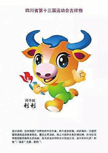 吉祥物是廣元野生羚牛娃形象。羚牛姿態(tài)挺拔,威武雄壯,凸顯矯健快速的運動體育特點,展現(xiàn)無畏艱險、向上沖勁和體育拼搏精神。羚牛娃面帶微笑,敞開胸懷大步向前,充滿好客熱情和吉祥祝福之情。名字利利代表“利州”,諧音“力量、勝利”。
