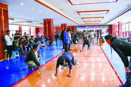 今年,我州將由115名運(yùn)動(dòng)員、教練員等組成11支運(yùn)動(dòng)隊(duì),參與賽事設(shè)置的8個(gè)競(jìng)賽項(xiàng)目和2個(gè)表演項(xiàng)目,其中有兩支隊(duì)伍將參與綜合類(lèi)表演項(xiàng)目比賽。我州總參賽人數(shù)相比上一屆略有減少。我州參加綜合類(lèi)表演項(xiàng)目比賽的節(jié)目是《瑪亞切通》和《炯動(dòng)》?!冬攣喦型ā纷g為孔雀吃水,主要體現(xiàn)力量和平衡的動(dòng)作;《炯動(dòng)》取材于藏民族農(nóng)村修建房屋時(shí)的勞動(dòng)場(chǎng)面,以青年男女在勞動(dòng)過(guò)程中載歌載舞對(duì)歌或比拼勞動(dòng)成果、質(zhì)量、進(jìn)度為內(nèi)容,主要比拼身體的力量和靈活度。我州參加競(jìng)技類(lèi)表演項(xiàng)目比賽的節(jié)目是《嘎久》?!陡戮谩芬鉃榉嗰R鞍或吉祥翻越,是藏族人民節(jié)日聚會(huì)時(shí)的一種競(jìng)技體育活動(dòng),主要比拼靈活性、趣味性和技巧性。