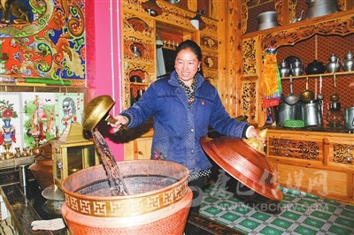 寬敞的院壩,卵石鋪就的花臺(tái)花開爭(zhēng)艷,獨(dú)立的衛(wèi)生間和廚房里,現(xiàn)代廚衛(wèi)一樣不缺,三個(gè)冰柜擺滿了食品,燒烤爐擺在廚房一角。走進(jìn)頂真的客廳,55吋的液晶電視,造型典雅別致的碗柜,琳瑯滿目的各式器皿,藏桌上擺滿了水果和飲料。坐在“豪華”的客廳里,頂真幸福開懷。