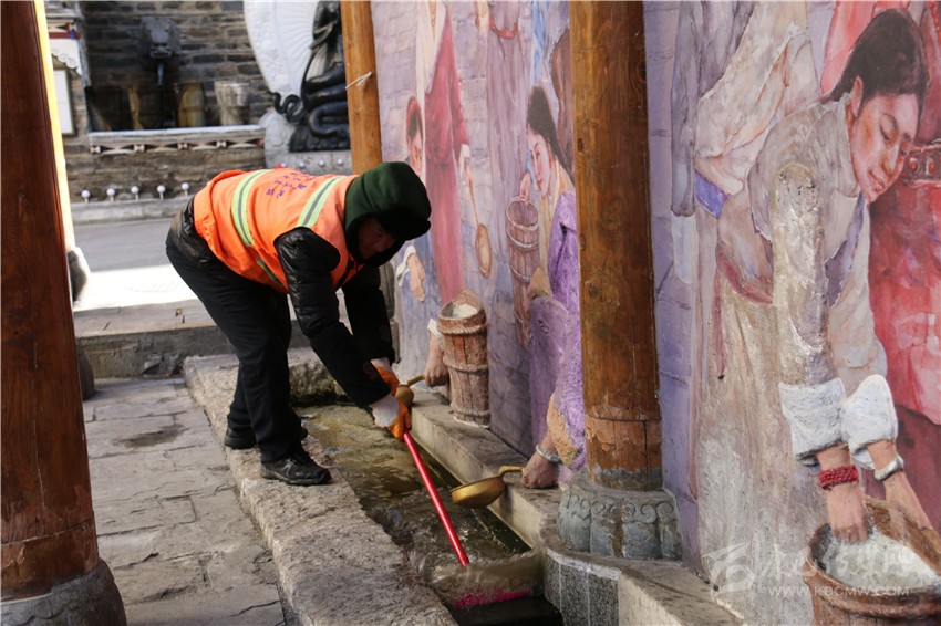 每逢節(jié)假日,是環(huán)衛(wèi)工人最忙最累的時(shí)候。2月5日下午,康定強(qiáng)盛公司清洗組組長楊曉康帶著全組工作人員來到康定市水井子,打掃整個(gè)水井子的環(huán)境衛(wèi)生?!俺跻弧畵岊^水’是多年來康定市民的過年習(xí)俗,我們現(xiàn)在把這里打掃干凈,讓市民們在‘搶頭水’時(shí)有干凈整潔的環(huán)境?!睏顣钥蹈嬖V記者。