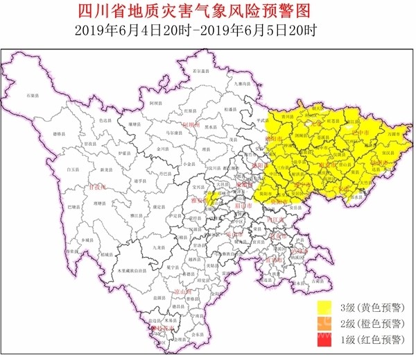 四川在線消息(記者 寇敏芳)6月4日,省自然資源廳發(fā)布全省地災(zāi)氣象風(fēng)險(xiǎn)預(yù)警。結(jié)合四川省氣象臺(tái)天氣預(yù)報(bào)情況,6月4日20時(shí)~6月5日20時(shí),全省地質(zhì)災(zāi)害氣象風(fēng)險(xiǎn)預(yù)警等級(jí)為3級(jí)(黃色預(yù)警,注意級(jí)),具體結(jié)果如下: