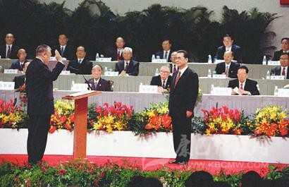 1998年5月5日,全國人民代表大會(huì)澳門特別行政區(qū)籌備委員會(huì)在北京人民大會(huì)堂宣告成立并舉行第一次全體會(huì)議。這是李鵬同志為籌備委員會(huì)副主任委員何厚鏵頒發(fā)任命書。 新華社記者 鞠鵬 攝