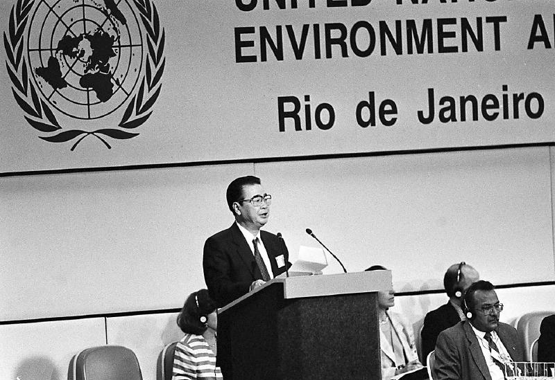 1992 年 6月12日,李鵬同志在聯(lián)合國環(huán)境與發(fā)展大會(huì)首腦會(huì)議上發(fā)言。 新華社記者 李生南 攝