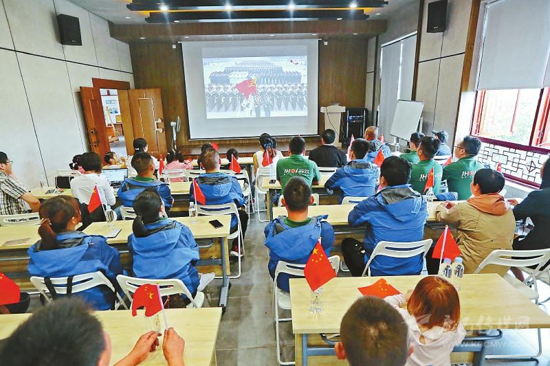 直播中,當鮮艷的五星紅旗在天安門廣場上冉冉升起時,戰(zhàn)旗村黨群服務中心,700多名干部群眾集體起立,唱響國歌。