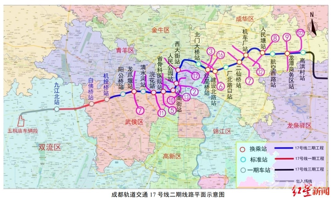 紅星新聞記者了解到,17號線一期工程已于2017年1月開工建設(shè),計劃于2020年12月底建成投入試運營。本次環(huán)評公示的17號線二期工程位于成都市雙流區(qū)、武侯區(qū)、青羊區(qū)、金牛區(qū)和成華區(qū),工程起于一期工程機投橋站(不含),止于高洪片區(qū)的高洪村站(含),線路自西向東沿永康路-晉陽路-龍騰東路-大石西路-小南街-北較場西路-成華街-張家巷-建設(shè)北路-二仙橋北路-航天路敷設(shè)。線路長約24.8km,均為地下線路,共設(shè)置地下車站18座,其中有換乘站12座。