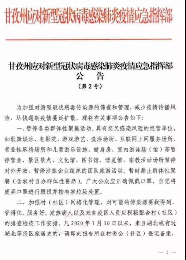 一、暫停各類群體性聚集活動(dòng)。具有交叉感染風(fēng)險(xiǎn)的經(jīng)營單位,如歌舞娛樂、電影院、游戲游藝、洗浴場所、互聯(lián)網(wǎng)上網(wǎng)服務(wù)場所、營業(yè)性麻將場所和兒童游樂設(shè)施、健身房、室內(nèi)游泳場(館)等暫停營業(yè),景區(qū)景點(diǎn)、文化館、圖書館、博覽館、宗教活動(dòng)場所暫停對(duì)外開放,暫停涉旅企業(yè)組織的團(tuán)隊(duì)旅游活動(dòng)。暫時(shí)禁止群體性聚餐(含農(nóng)村自辦群體性宴席)。廣大公眾應(yīng)正確佩戴口罩,自覺將廢棄口罩進(jìn)行毀損并按有害垃圾處置。二、加強(qiáng)村(社區(qū))網(wǎng)格化管理,對(duì)可能的傳染源要找得到、管得住、服務(wù)好。發(fā)熱病人以及來自疫區(qū)人員應(yīng)積極配合村(社區(qū))的排查檢疫工作安排。凡2020年1月10日以來,來自湖北或有過湖北等疫區(qū)旅居史的,請(qǐng)即刻報(bào)告所在村委會(huì)(社區(qū))登記備案,并自進(jìn)州之日起自覺居家隔離14天。同時(shí),當(dāng)?shù)蒯t(yī)療衛(wèi)生機(jī)構(gòu)要做好健康登記工作,一旦出現(xiàn)發(fā)熱、乏力、呼吸困難、呼吸道感染(干咳為主)等癥狀,請(qǐng)立即佩戴口罩就近到當(dāng)?shù)蒯t(yī)療機(jī)構(gòu)發(fā)熱門診就診。即將外出務(wù)工人員離開現(xiàn)居住地時(shí),主動(dòng)到就近醫(yī)療衛(wèi)生機(jī)構(gòu)接受健康檢查。三、暫停全州活畜禽交易及宰殺經(jīng)營行為,實(shí)行活畜禽定點(diǎn)宰殺、集中檢疫、白條禽(肉)上市。市場主辦單位或個(gè)人要按衛(wèi)生防疫要求對(duì)交易場所、設(shè)施設(shè)備進(jìn)行清洗消毒,活禽宰殺設(shè)施等要符合動(dòng)物防疫、衛(wèi)生等相關(guān)要求,實(shí)行封閉管理,并與銷售區(qū)域?qū)嵭形锢砀綦x。禁止從事野生動(dòng)物捕獵、交易,野生動(dòng)物飼養(yǎng)繁育場所應(yīng)實(shí)施隔離措施,禁止餐飲服務(wù)單位和個(gè)人使用野生動(dòng)物加工、制售食品。加強(qiáng)對(duì)涉畜禽人員相關(guān)防控知識(shí)宣傳和教育,指導(dǎo)其做好健康防護(hù)工作。四、州域內(nèi)所有單位和個(gè)人,必須接受衛(wèi)生行政主管部門或有關(guān)機(jī)構(gòu)的流行病學(xué)調(diào)查,確診或疑似病例應(yīng)全力配合有關(guān)機(jī)構(gòu)落實(shí)傳染病的調(diào)查、樣本采集、檢測、集中隔離治療等防控措施,不得隱報(bào)、緩報(bào)、謊報(bào)或者授意他人隱報(bào)、緩報(bào)、謊報(bào)有關(guān)情況。對(duì)拒絕配合的,公安機(jī)關(guān)將依法協(xié)助強(qiáng)制執(zhí)行;對(duì)妨礙執(zhí)行公務(wù)的,公安機(jī)關(guān)將依法從嚴(yán)從重處理。五、對(duì)重點(diǎn)醫(yī)療防控物資實(shí)行統(tǒng)一收儲(chǔ)、統(tǒng)一調(diào)配。甘孜州應(yīng)對(duì)新型冠狀病毒感染肺炎疫情應(yīng)急指揮部