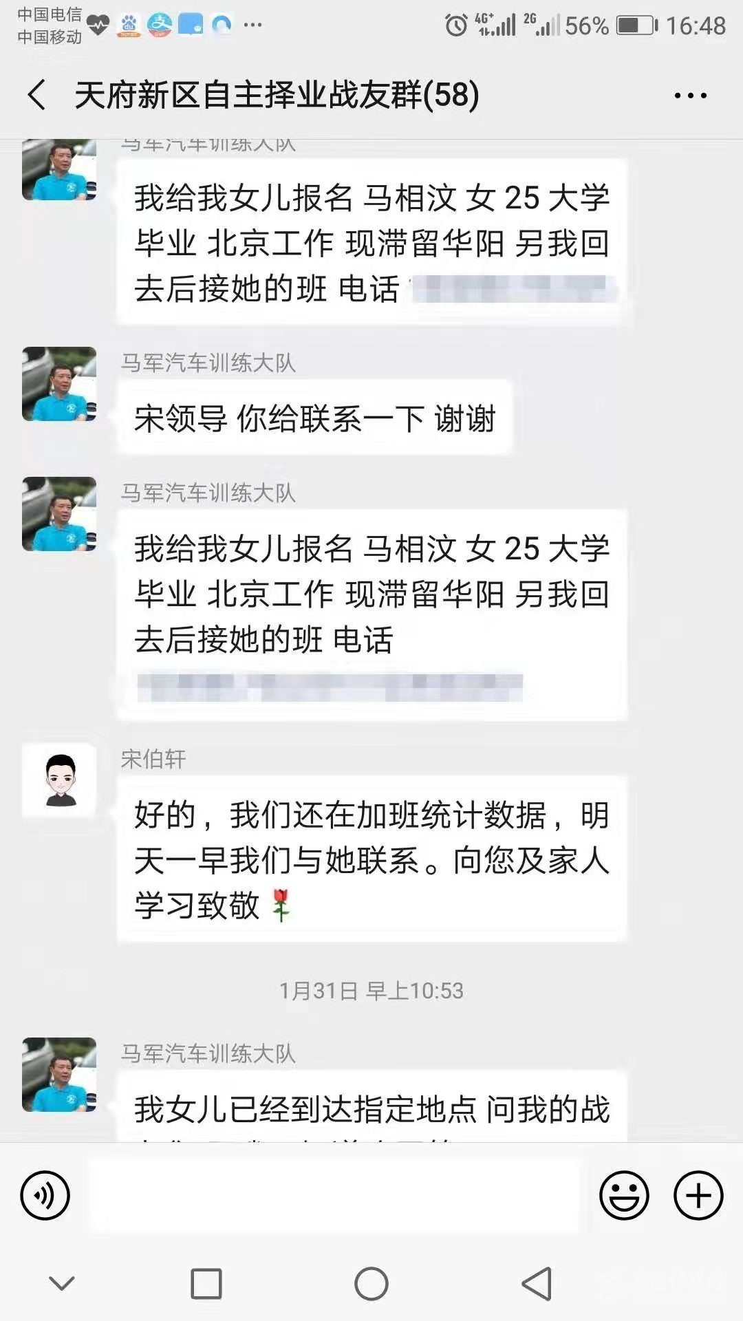 “我給我女兒報名,馬相汶,女,25歲,大學(xué)畢業(yè),北京工作,現(xiàn)滯留成都,另我回去后接她的班?!苯?,一條微信截圖傳遍了天府新區(qū)退役軍人的朋友圈。