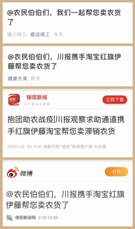 多地市州媒體及縣級融媒體中心的關(guān)注積極響應(yīng)參與活動。“網(wǎng)信四川”公眾號、南充日報“南充見”、成都日報錦觀、眉山在線、開江發(fā)布、直播鹽亭、綿陽新聞網(wǎng)、宜賓日報、威遠(yuǎn)組工、健康大英等均及時對活動相關(guān)信息進(jìn)行了發(fā)布,及時把抱團(tuán)助農(nóng)戰(zhàn)疫活動信息帶給當(dāng)?shù)赜行枨蟮霓r(nóng)戶。