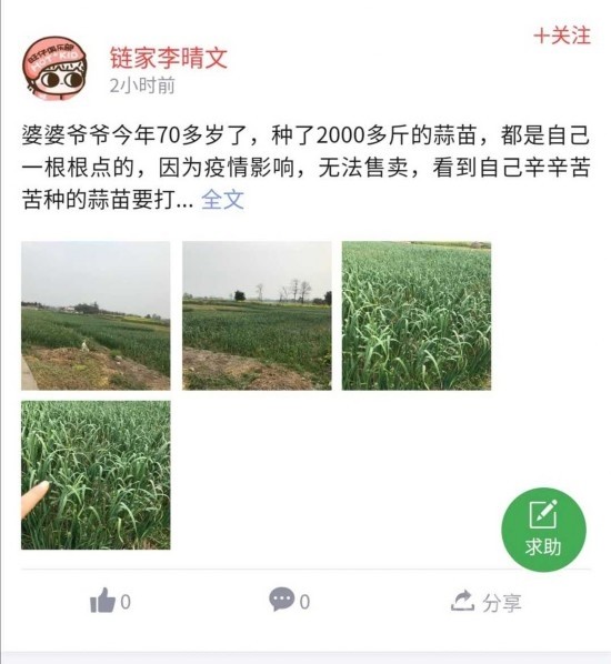 “婆婆爺爺今年70多歲了,種了2000多斤的蒜苗,都是自己一根根點的,因為疫情影響,無法售賣,看到自己辛辛苦苦種的蒜苗要打水漂,兩個老人都要急哭了?!奔易〕啥寂碇菔械睦钚〗阃ㄟ^“抱團(tuán)助農(nóng)戰(zhàn)疫”平臺求助表示,希望能夠幫忙盡快處理這些蒜苗。