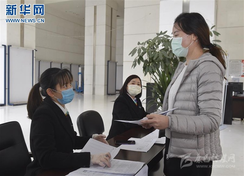 “女子服務(wù)隊(duì)”工作人員沈娜(左)向成都市金貿(mào)大廈物管公司管理人員了解防疫物資準(zhǔn)備情況(2月28日攝)。 新華社記者 劉坤 攝