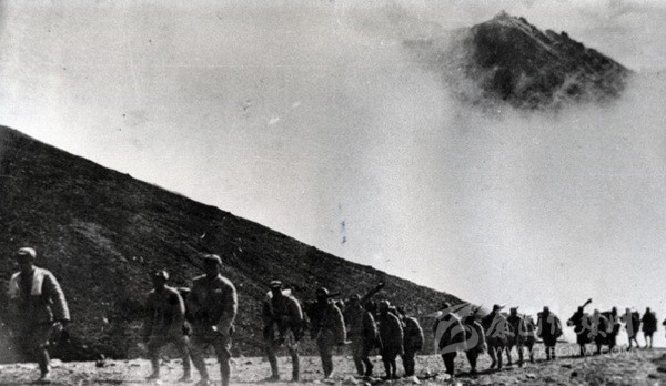 圖為進(jìn)軍西藏途中的十八軍戰(zhàn)士,背后是高聳入云的山峰。圖片來源:網(wǎng)絡(luò)