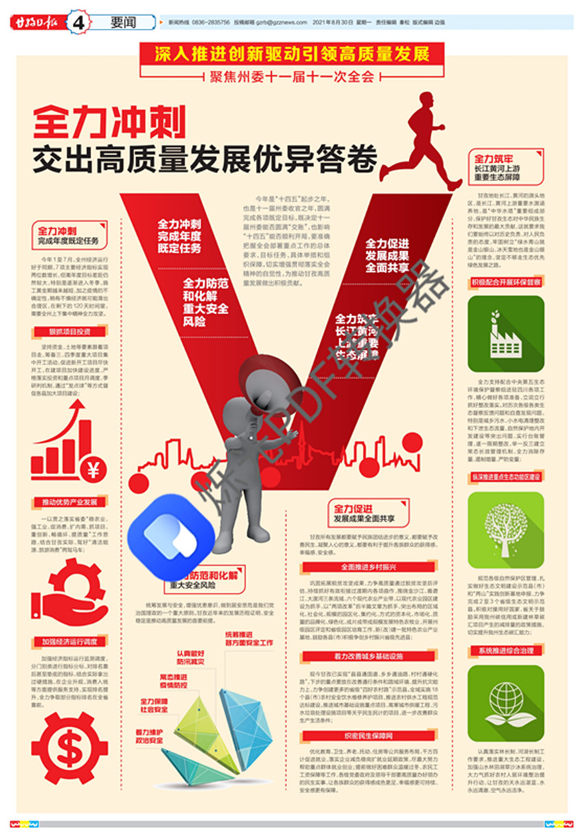 全會(huì)提出了深入推進(jìn)創(chuàng)新驅(qū)動(dòng)引領(lǐng)高質(zhì)量發(fā)展的目標(biāo)任務(wù),這就是:經(jīng)過“十四五”時(shí)期努力,形成川西北生態(tài)示范區(qū)綠色發(fā)展科技支撐體系。綜合創(chuàng)新能力明顯提升,形成一批有份量的科技成果和示范應(yīng)用成果。高原特色產(chǎn)業(yè)科技含量普遍提高,信息化與一、二、三產(chǎn)業(yè)的融合發(fā)展成效明顯。生態(tài)保護(hù)和建設(shè)步伐加快,綠色低碳循環(huán)發(fā)展體系基本形成,長(zhǎng)江、黃河上游重要生態(tài)屏障進(jìn)一步筑牢。數(shù)字甘孜建設(shè)成效顯著,信息化基礎(chǔ)逐步夯實(shí),信息應(yīng)用大幅提升。民生領(lǐng)域科技創(chuàng)新應(yīng)用進(jìn)一步推廣,教育、衛(wèi)生、社會(huì)保障等公共服務(wù)能力和水平不斷提高。社會(huì)治理創(chuàng)新能力進(jìn)一步提升,社會(huì)治理現(xiàn)代化水平不斷提高。創(chuàng)新主體發(fā)展壯大,創(chuàng)新創(chuàng)業(yè)能力大幅提升。創(chuàng)新環(huán)境明顯優(yōu)化,創(chuàng)新要素保障有力。