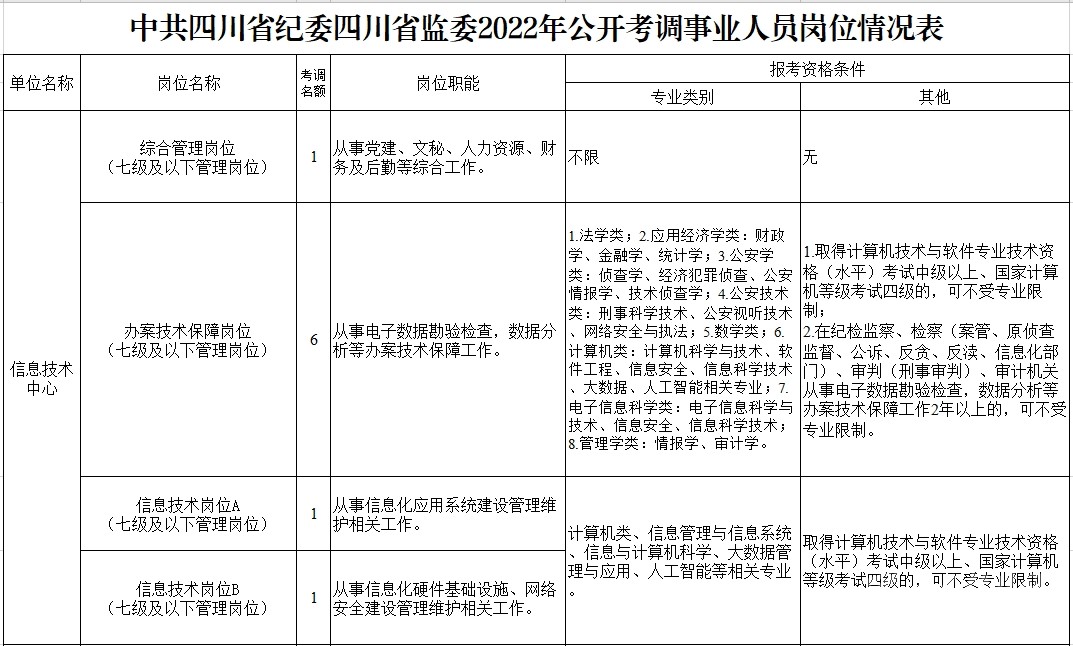 考調(diào)名額 考調(diào)事業(yè)人員25名。其中,信息技術(shù)中心管理崗位9名,黨風(fēng)廉政建設(shè)研究教育中心管理崗位6名、專業(yè)技術(shù)崗位3名,金泉辦案服務(wù)中心管理崗位7名。 考調(diào)對象及條件 考調(diào)對象 全省范圍內(nèi)行政單位或參公事業(yè)單位一級主任科員(含)以下職級及相當(dāng)職務(wù)層次人員;縣級及以上公益一類或全額撥款事業(yè)單位管理崗位七級及以下職員、專業(yè)技術(shù)崗位中級及以下工作人員。 考調(diào)條件 具有良好的政治素質(zhì)、專業(yè)素養(yǎng),品行端正,實(shí)績突出,群眾公認(rèn)。 中共黨員。 全日制大學(xué)本科及以上學(xué)歷,并取得相應(yīng)學(xué)士及以上學(xué)位。 年齡35周歲以下(1986年2月11日及以后出生)。 歷年年度考核均為合格(稱職)及以上。 身體心理健康,具有正常履行職責(zé)的身體條件和心理素質(zhì)。 符合報(bào)考崗位規(guī)定的資格條件,詳見《中共四川省紀(jì)委四川省監(jiān)委2022年公開考調(diào)事業(yè)人員崗位情況表》(附后)。 符合法律、法規(guī)規(guī)定的其他條件。 有關(guān)時(shí)間計(jì)算均截至2022年2月11日。 具有下列情形之一的,不得報(bào)考: 被依法列為失信聯(lián)合懲戒對象的。 涉嫌違紀(jì)違法正在接受有關(guān)專門機(jī)關(guān)審查尚未作出結(jié)論的。 受過黨紀(jì)政務(wù)處分或司法機(jī)關(guān)刑事處罰的。 受到誡勉、組織處理等影響期未滿或期滿影響使用的。 按照有關(guān)規(guī)定,到定向單位工作未滿服務(wù)年限或有其他限制性規(guī)定的。 尚在試用期的。 按照相關(guān)規(guī)定應(yīng)當(dāng)回避的。 法律、法規(guī)規(guī)定的其他情形。 報(bào)名及打印準(zhǔn)考證 2022年2月22日上午8:00至2月26日下午18:00,報(bào)名人員登錄四川省人力資源和社會(huì)保障廳官網(wǎng)(http://rst.sc.gov.cn/)首頁“人事考試”專欄進(jìn)行網(wǎng)上報(bào)名,每人限報(bào)一個(gè)崗位。 對報(bào)名人員進(jìn)行網(wǎng)上資格初審,通過資格初審者可于2022年3月1日上午8:00至3月2日下午18:00,登陸報(bào)名系統(tǒng)打印筆試準(zhǔn)考證。 考試 考試分筆試和面試。其中,信息技術(shù)崗位A、信息技術(shù)崗位B、宣傳專業(yè)技術(shù)崗位需加試專業(yè)測試。 根據(jù)筆試情況,擇優(yōu)確定進(jìn)入面試的人選,并適時(shí)開展資格復(fù)審和心理素質(zhì)測試。資格復(fù)審、心理素質(zhì)測試、面試時(shí)間和地點(diǎn)另行電話通知。 考察、體檢及試用 考察 根據(jù)考試情況,擇優(yōu)差額確定進(jìn)入考察對象,深入考察了解人選政治表現(xiàn)、工作能力、廉潔自律和性格特點(diǎn)等。 體檢 根據(jù)考察情況和職位要求,擇優(yōu)等額確定進(jìn)入體檢人選,參照《公務(wù)員錄用體檢通用標(biāo)準(zhǔn)(試行)》進(jìn)行體檢。 頂崗試用 綜合人選考試成績、考察情況,根據(jù)工作需要和人崗相適原則,擇優(yōu)確定頂崗試用人選。 調(diào)入 試用期滿后,根據(jù)考調(diào)名額和試用期間表現(xiàn),研究確定擬調(diào)人員,經(jīng)公示后按規(guī)定程序辦理調(diào)入手續(xù)。 注意事項(xiàng) 報(bào)考者應(yīng)保證提供真實(shí)、準(zhǔn)確、全面的個(gè)人信息和資料,如有弄虛作假的行為,將按有關(guān)規(guī)定嚴(yán)肅處理。 資格審查貫穿考調(diào)全過程,任一環(huán)節(jié)發(fā)現(xiàn)有不符合考調(diào)條件的,取消考調(diào)資格。 報(bào)名時(shí)請按要求填寫本人手機(jī)號碼,并保持通訊暢通。未入圍下一環(huán)節(jié)人員,不再另行通知。 進(jìn)入資格復(fù)審者,需由有干部管理權(quán)限的主管部門出具同意考調(diào)的書面意見并加蓋公章。 嚴(yán)明考調(diào)紀(jì)律,報(bào)名者不得托人說情、打招呼,一經(jīng)發(fā)現(xiàn)即取消資格。 遵守疫情防控相關(guān)規(guī)定,服從工作人員安排。 同時(shí),四川省紀(jì)委監(jiān)委還提供相關(guān)咨詢電話:028—62555435;62555354。 (點(diǎn)擊查看大圖)