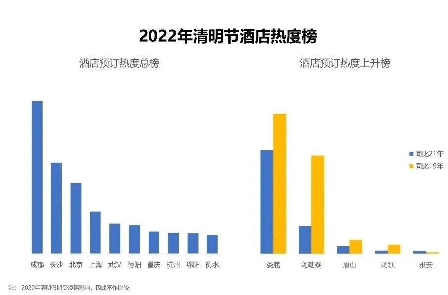 攜程數智酒店大數據出具的《2022年清明節(jié)預測報告》也顯示,2022年清明期間,在全國文旅市場遇冷的情況下,成都、長沙、北京的酒店生意預測相對較好,位居熱度榜單前三。眉山、阿壩、雅安等城市的酒店預訂熱度同比2021年上升明顯。