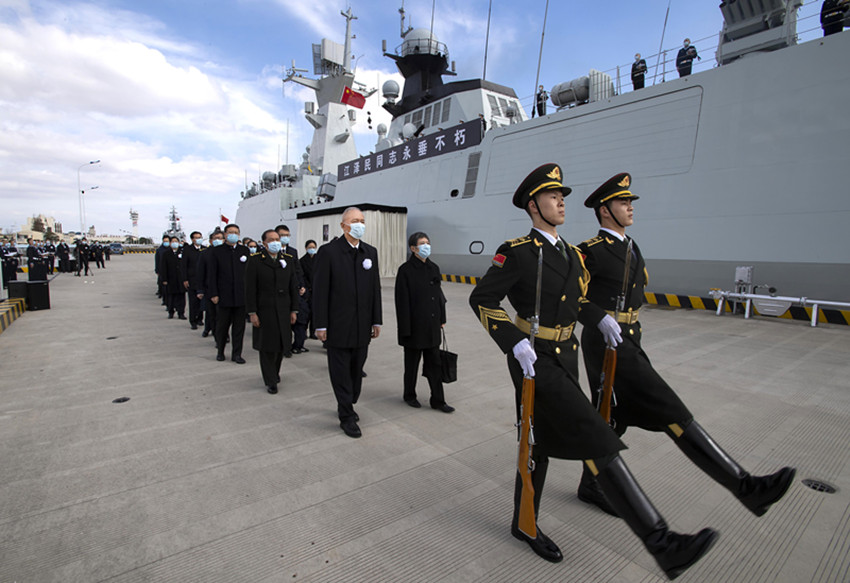 吳淞軍港碼頭,國旗半垂,莊嚴肅穆。黑底白字橫幅上寫著:“江澤民同志永垂不朽”“江澤民同志永遠活在我們心中”。海軍官兵整齊列隊,脫帽致禮。江澤民同志的親屬捧護著骨灰走下靈車,將骨灰安放在靈桌上。低回的哀樂聲中,送別的人們神情凝重,列隊肅立,深深鞠躬,向江澤民同志作最后的告別。