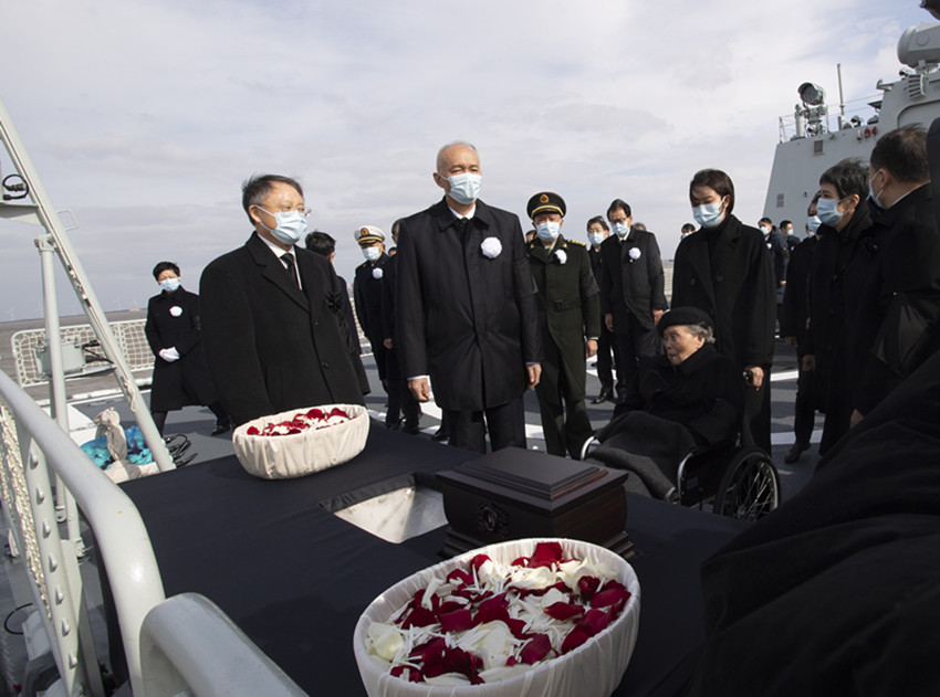 受黨中央委托,中共中央政治局常委、中央書記處書記蔡奇等領導同志和江澤民同志的夫人王冶坪等親屬護送骨灰撒放