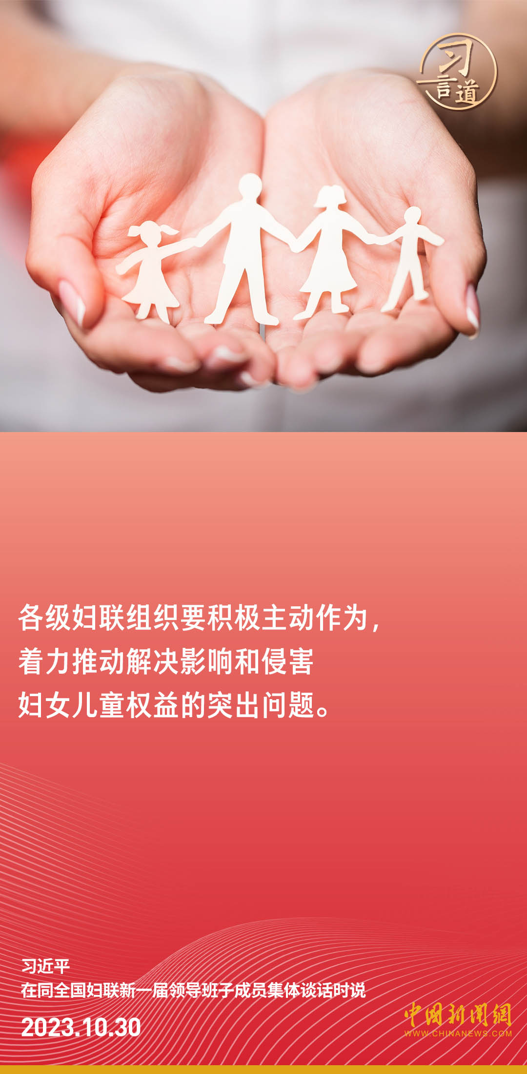 中共中央總書記、國家主席、中央軍委主席習(xí)近平30日下午在中南海同全國婦聯(lián)新一屆領(lǐng)導(dǎo)班子成員集體談話并發(fā)表重要講話。習(xí)近平強(qiáng)調(diào)——