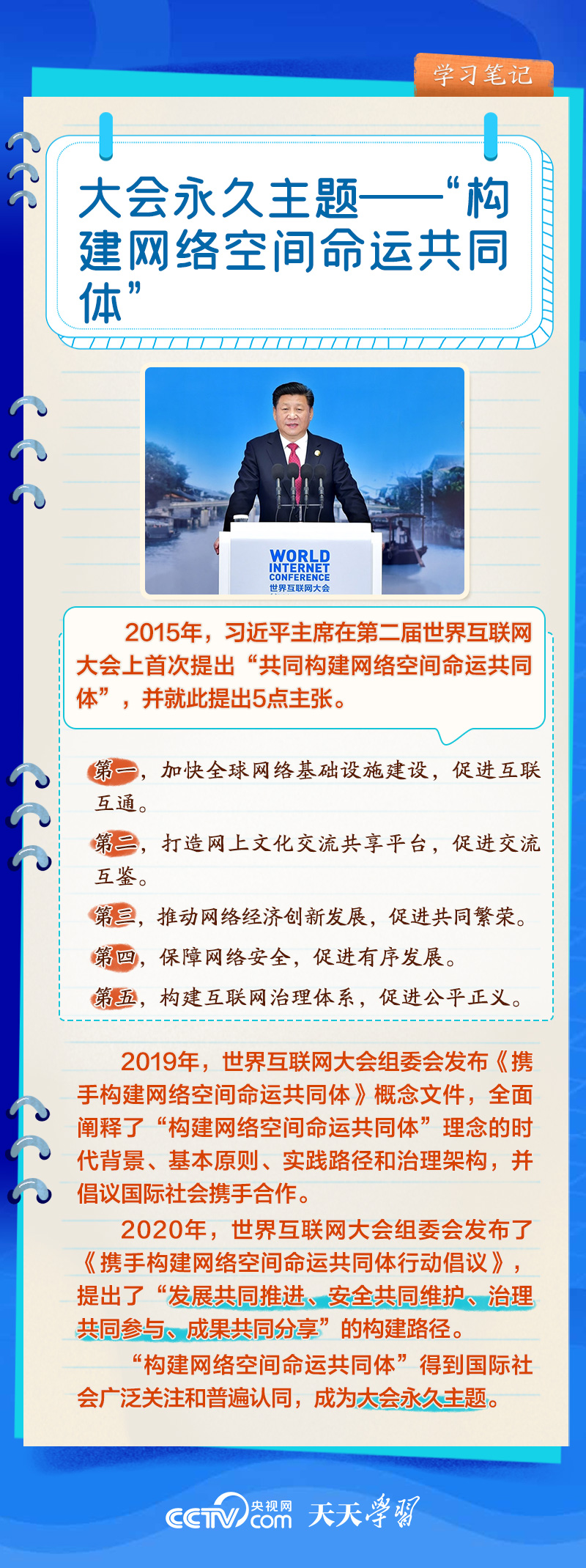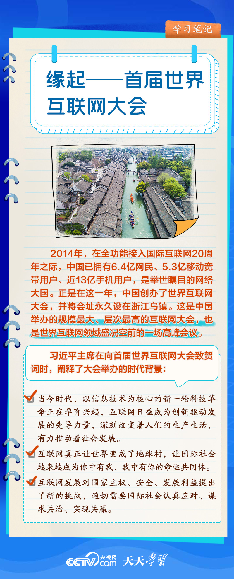 前九屆世界互聯(lián)網(wǎng)大會(huì),習(xí)近平主席或親臨現(xiàn)場(chǎng)發(fā)表主旨演講,或視頻致辭,或向大會(huì)發(fā)來賀信,以不同形式關(guān)心大會(huì)舉辦。央視網(wǎng)《天天學(xué)習(xí)》欄目推出學(xué)習(xí)筆記,與您一起了解世界互聯(lián)網(wǎng)大會(huì)的十年“網(wǎng)”事。