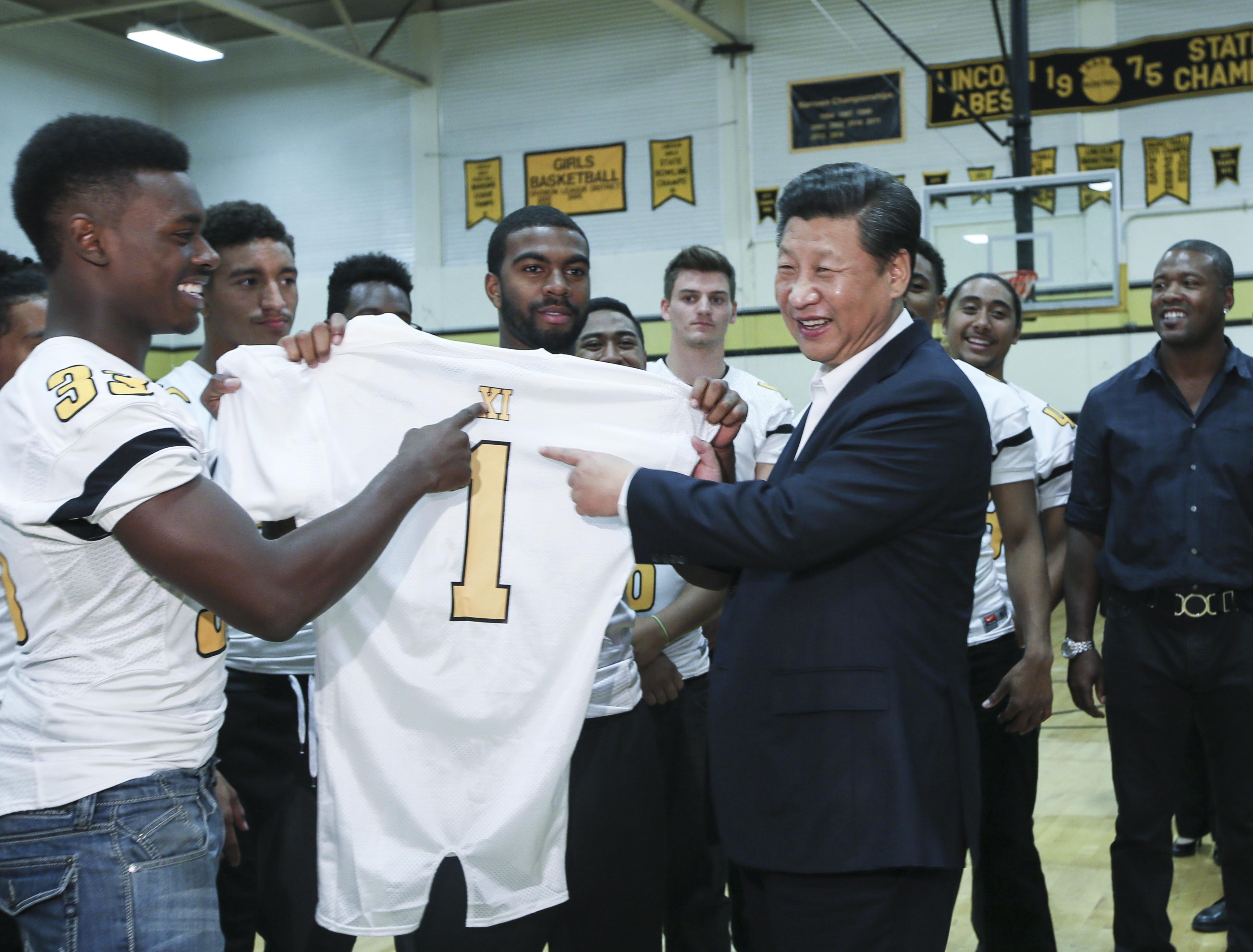 △ 2015年9月23日,國家主席習近平參觀美國塔科馬市林肯中學。這是習近平接受學生們贈送的橄欖球衣。