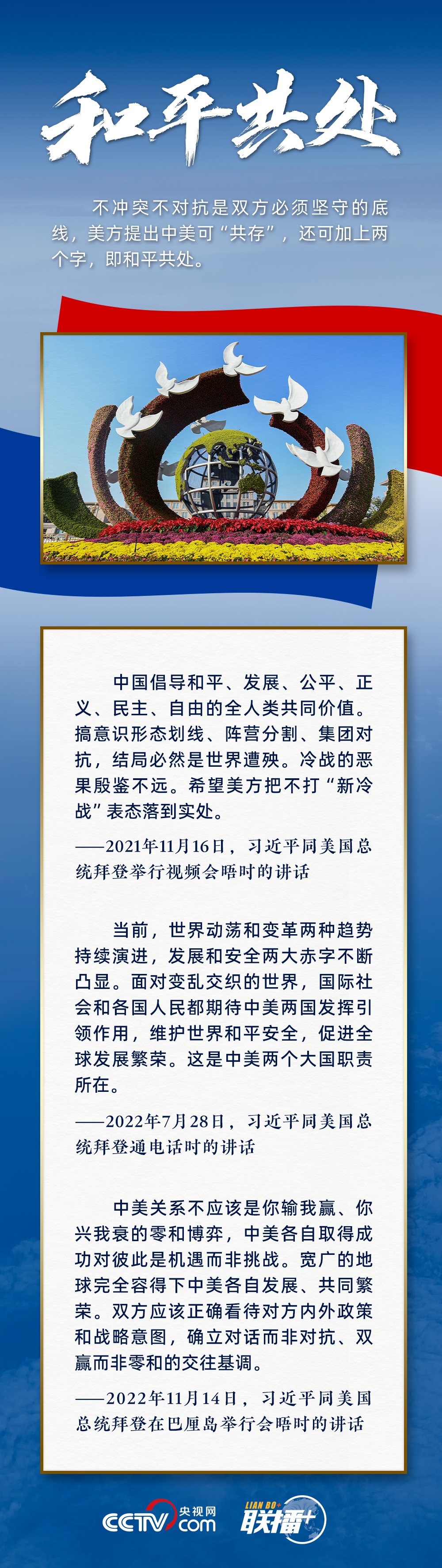 沖突、對抗不符合時代潮流,更解決不了本國自身的問題和世界面臨的挑戰(zhàn)。大國相處之道應(yīng)是對話合作而非零和博弈,和平共處是中美兩國應(yīng)共同守住的底線。世界期待中美關(guān)系盡快回到健康穩(wěn)定發(fā)展軌道,兩國共同維護世界和平穩(wěn)定,應(yīng)對全球性挑戰(zhàn),促進全球發(fā)展繁榮。