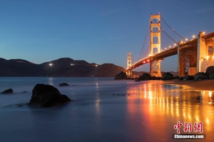 當(dāng)?shù)貢r(shí)間10月29日,美國(guó)舊金山金門大橋在海浪和夜色的襯托下美如一幅畫。中新社記者 劉關(guān)關(guān) 攝